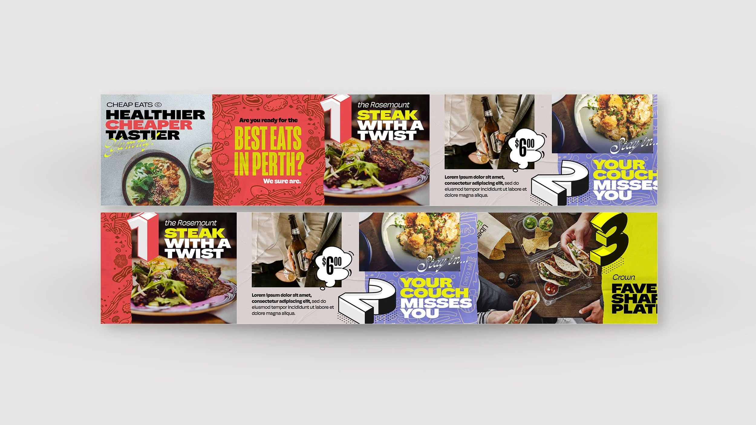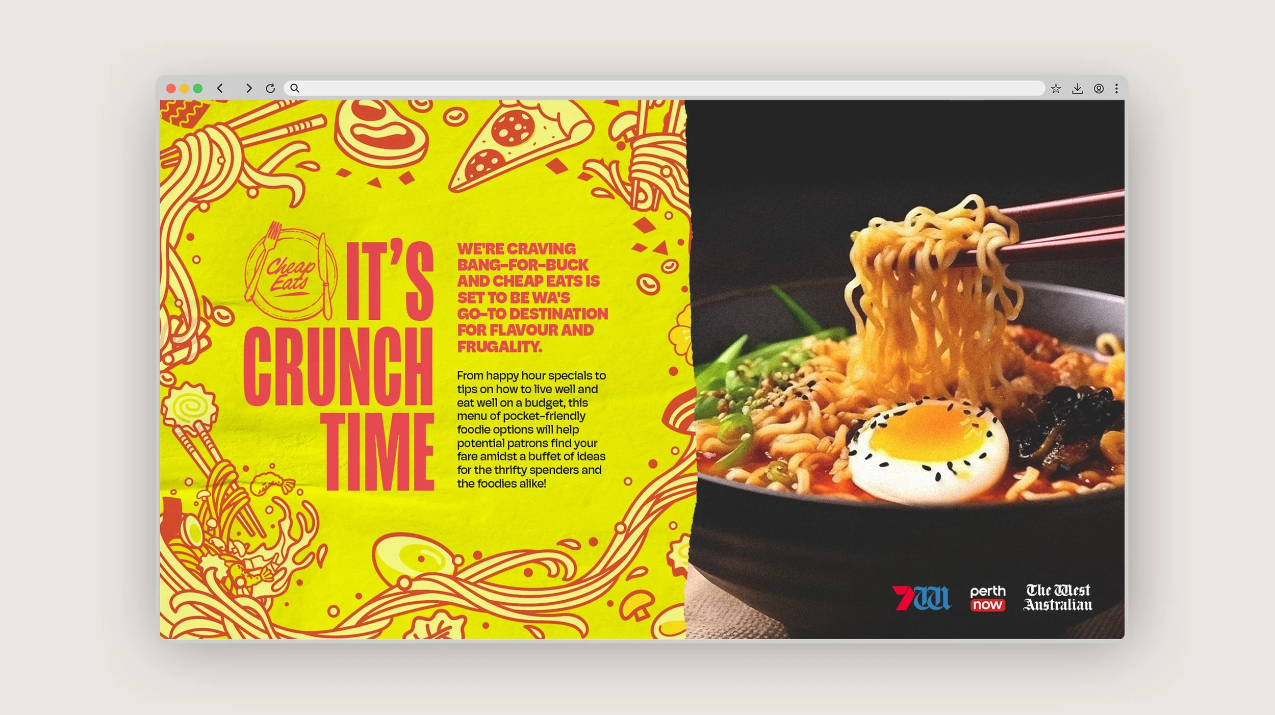 Bite Club was the brainchild of my creative director—a recurring editorial piece highlighting the best food on a budget across Perth. Participating eateries could buy into a ‘specials’ section, as well as be featured in the articles. We worked closely to develop a visual identity that would carry the ‘cheap eats ethos’—a visual identity that referenced street vendor aesthetics—striking, fun, and lo-fi. This was a great project to flex and explore my design skills in food and restaurant branding.