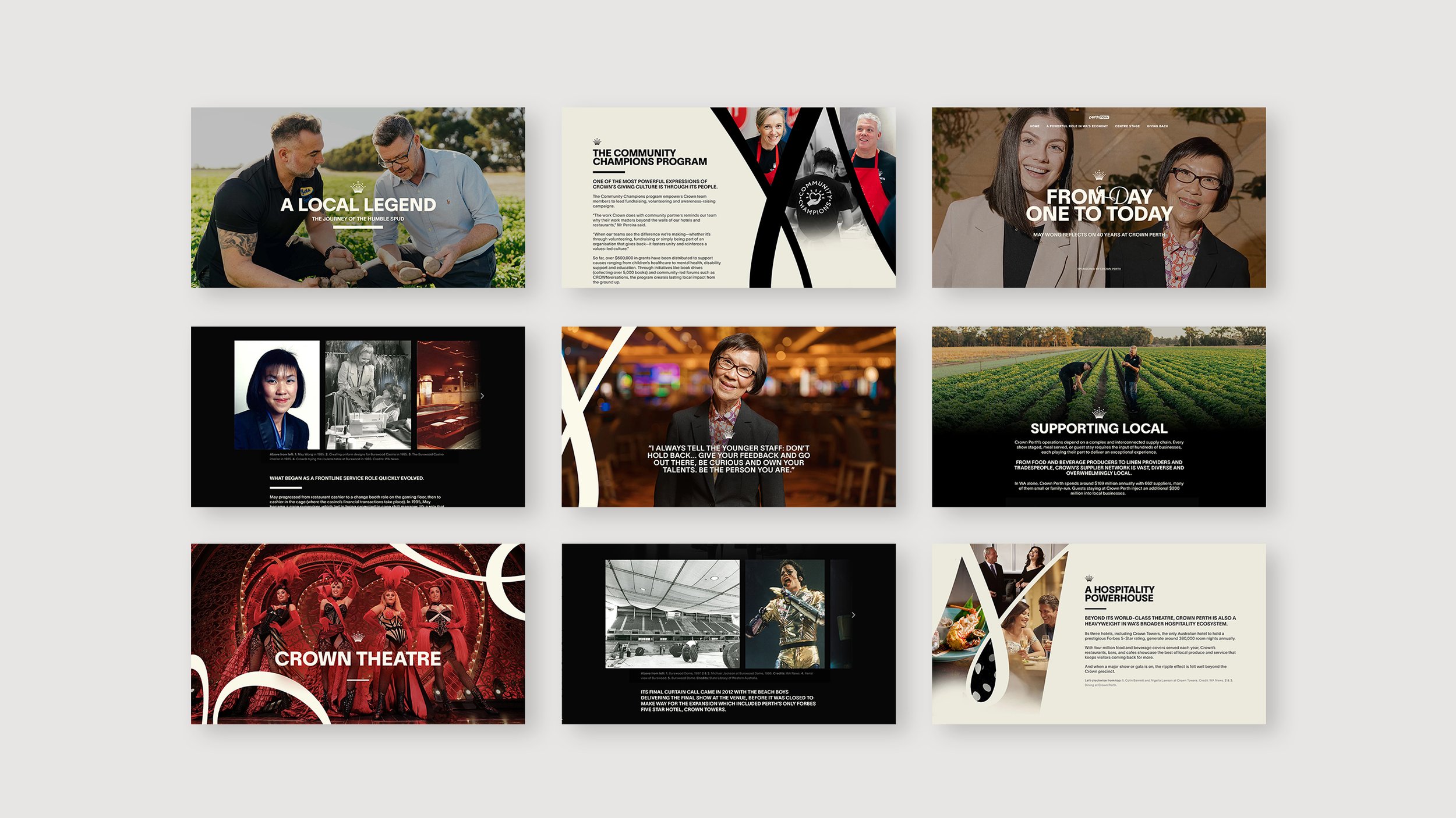 Crown Resorts is a large Australian entertainment and hospitality company known for operating integrated resorts in Melbourne, Perth, and Sydney. Coinciding with the 40th anniversary of Crown Perth (formerly Burswood Casino), the client was looking to create a multi-part human-interest piece housed on PerthNow, detailing the impact the entertainment complex has had on the city. The client preferred to divert away from the regular luxury visuals Crown often leads with, whilst maintaining their strong brand identity. The result was a multi-page digital hub delving into the people that power Crown Perth.