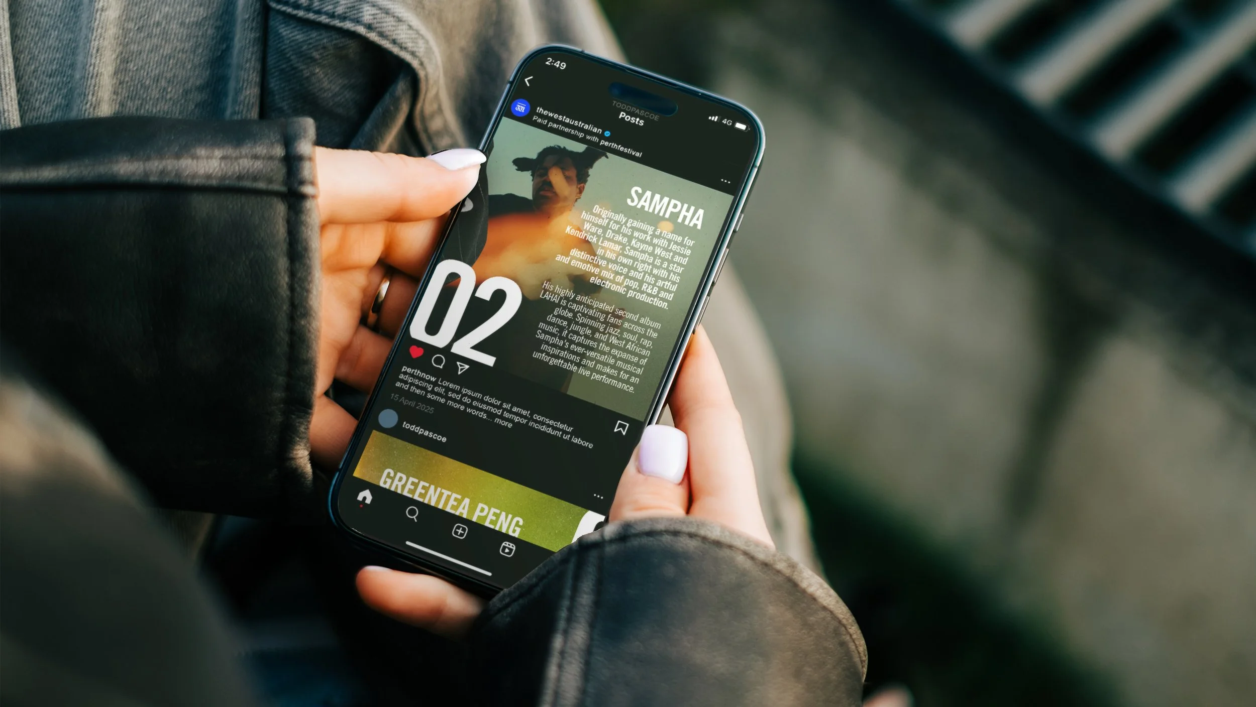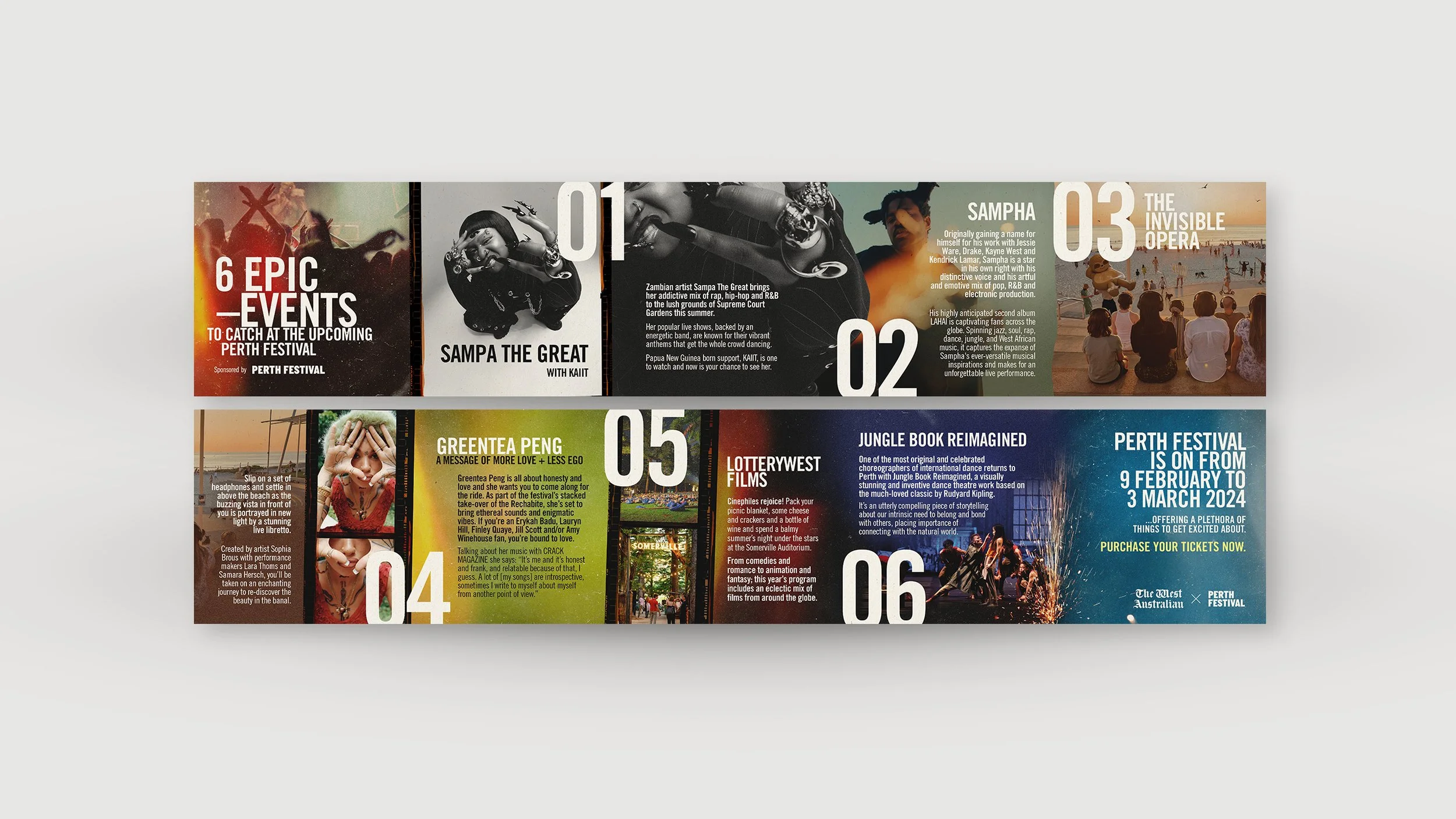 Perth Festival is Australia’s longest-running arts festival, celebrating music, film, visual arts and culture each February–March, highlighting Aboriginal and Torres Strait Islander heritage and featuring local and international artists. Previous performers have included Björk, Cate Blanchett and Royal de Luxe’s the Giants. For the 2023 festival, I was tasked by the client to create a swipe-able social carousel to showcase the next diverse lineup of international acts.