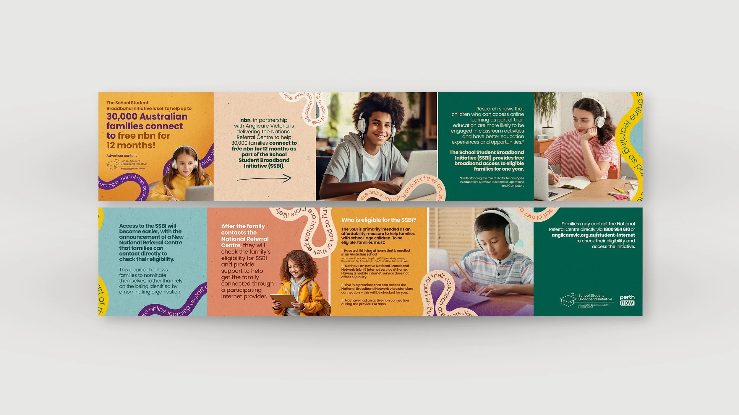 The School Student Broadband Initiative (SSBI) is an Australian Government program that provided free National Broadband Network (NBN) services for up to 30,000 eligible families with school-aged children in 2023. With minimal branding beyond a logo, my creative director and I developed promotional material for the initiative. We began by creating a custom brand guide to the client’s liking, then produced various digital display and social assets, including a swipe-able carousel highlighting the initiative.