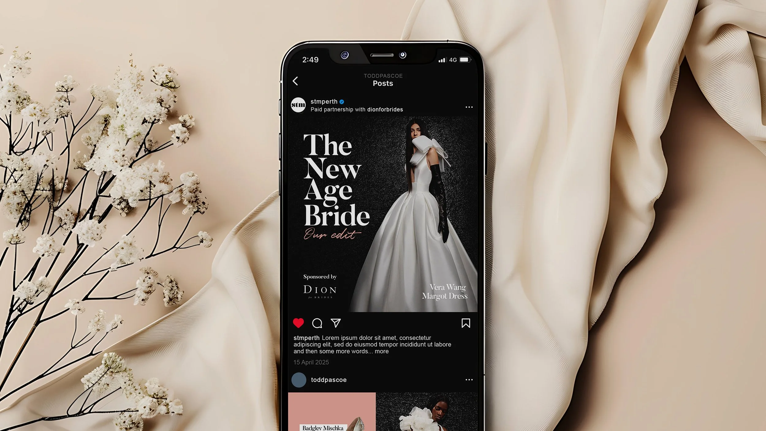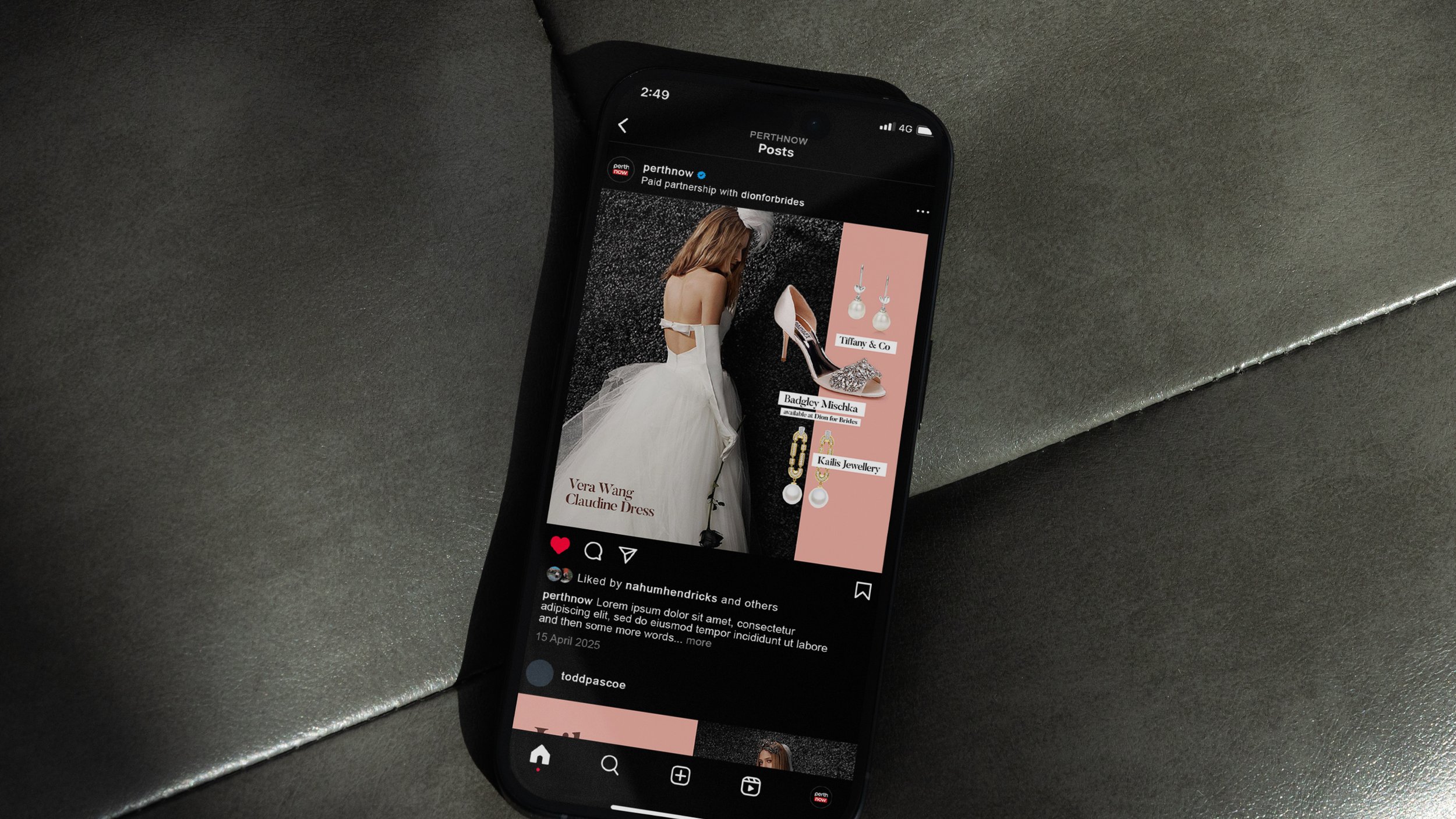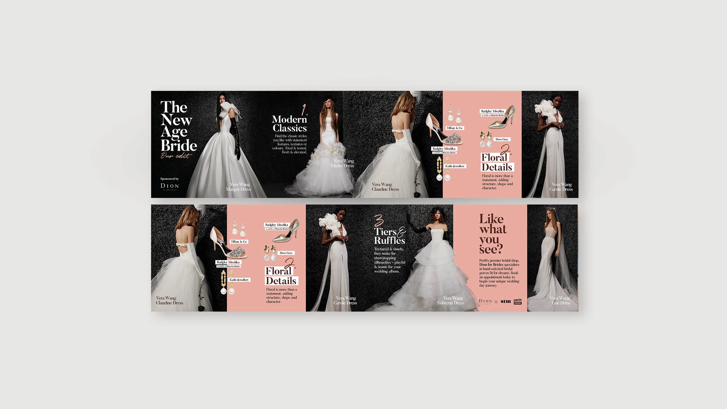 A swipe-able social carousel promoting a new range of wedding dresses stocked by local bridal boutique Dion For Brides. The focus was on showcasing the product and store accessories. The design aims for a seamless, sartorial scroll that uses shapes and forms to highlight campaign imagery, while staying true to STM Magazine’s editorial style.